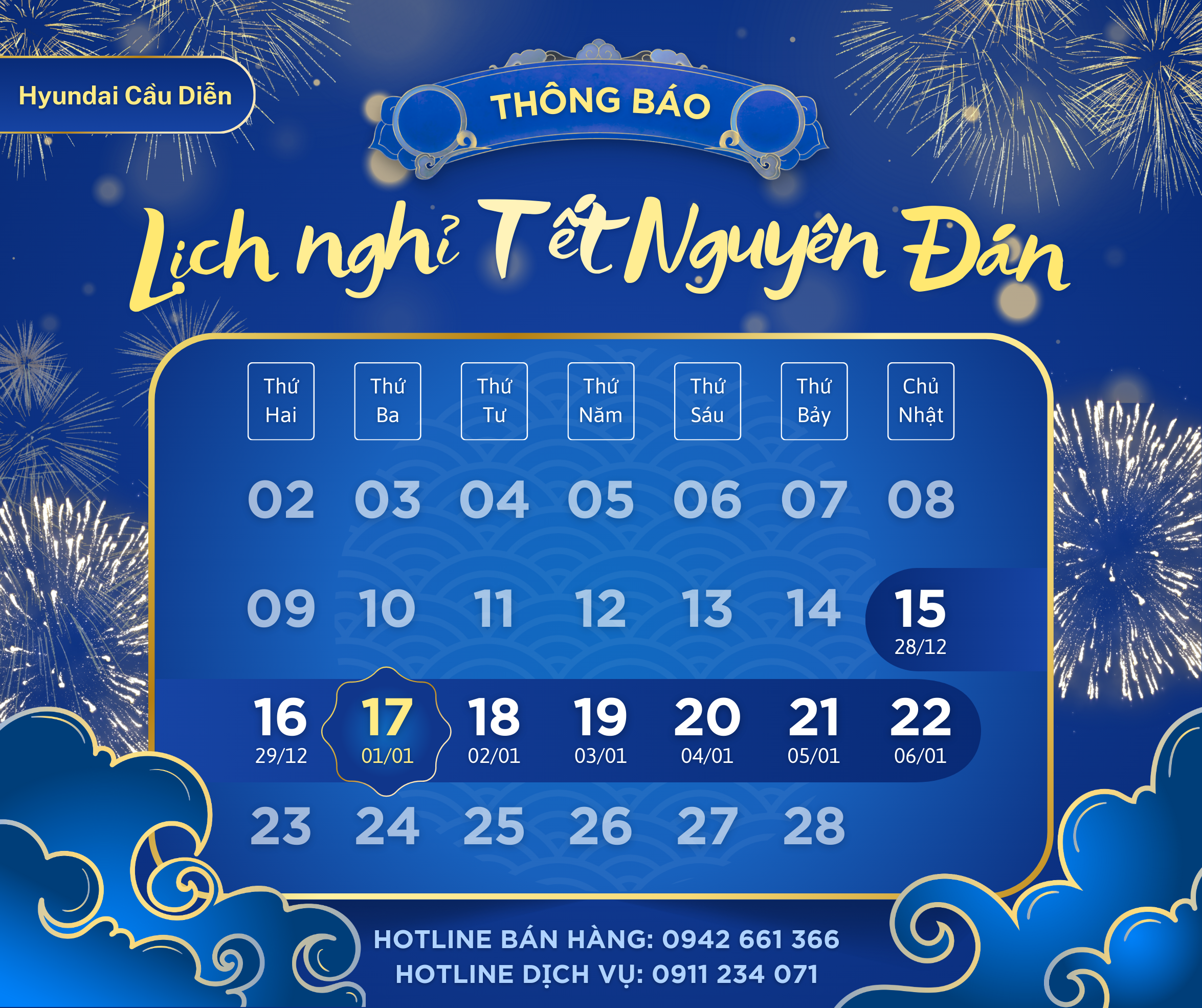 Nhân dịp năm mới, Hyundai Cầu Diễn xin gửi lời tri ân chân thành tới Quý Khách hàng và Quý Đối tác đã luôn tin tưởng, lựa chọn và đồng hành cùng chúng tôi trong suốt chặng đường vừa qua. Sự ủng hộ của Quý vị chính là động lực để Hyundai Cầu Diễn không ngừng nâng cao chất lượng sản phẩm và dịch vụ mỗi ngày.